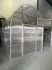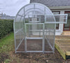 Metal Sigma 200 (Gen III) greenhouse structure with curved roof and transparent panels on a concrete floor.