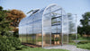 Modern Sigma 200 (Gen III) greenhouse with transparent walls and a curved roof in a garden setting - by Planta Greenhouses EU.